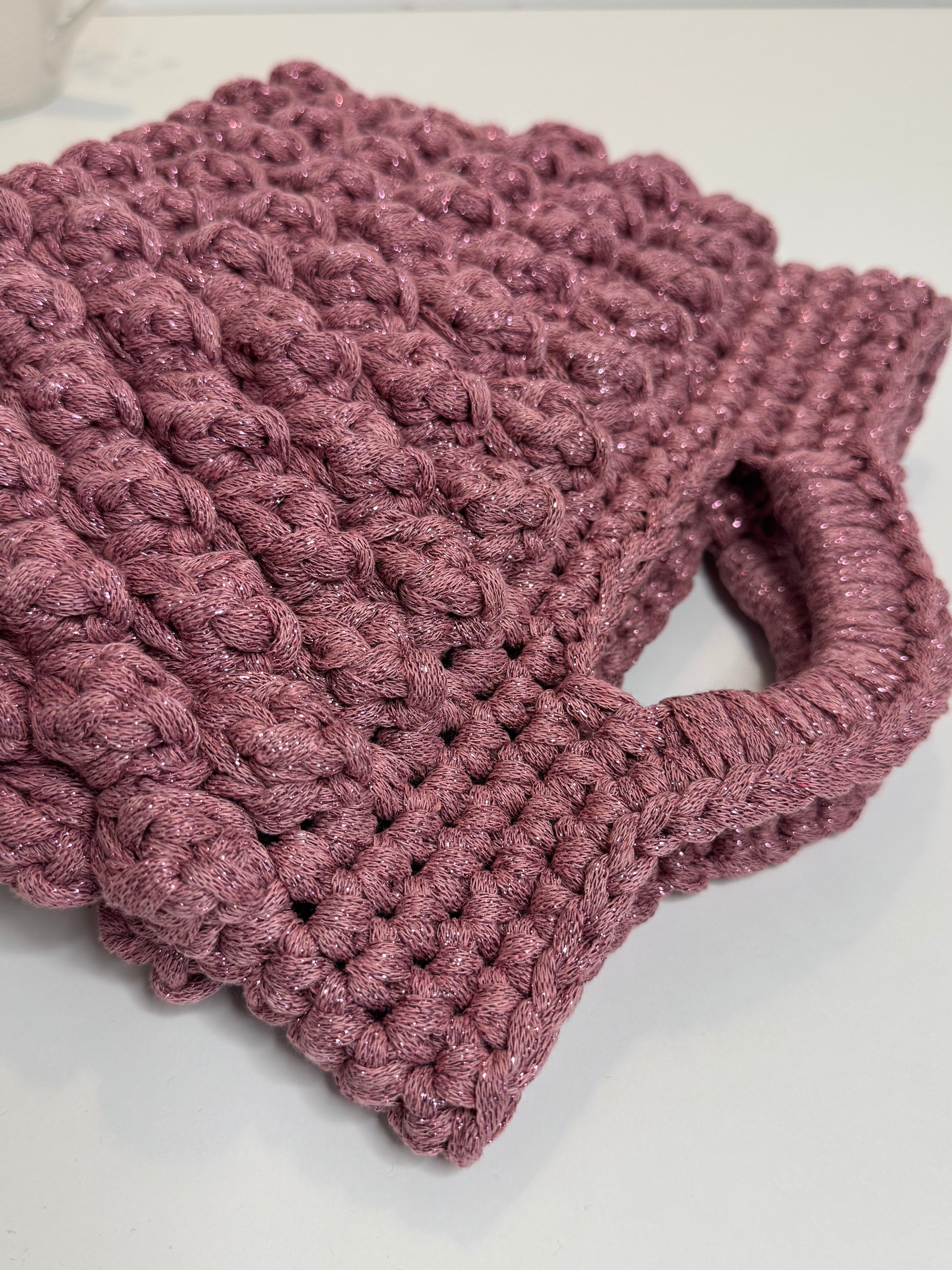 Este bolso es la combinación perfecta entre lo artesanal y lo sofisticado. Tejido a mano con trapillo de excelente calidad y delicados hilos de lurex que le dan un brillo sutil, elegante y moderno, es ideal para mujeres que buscan destacar con un accesorio único y con identidad.
