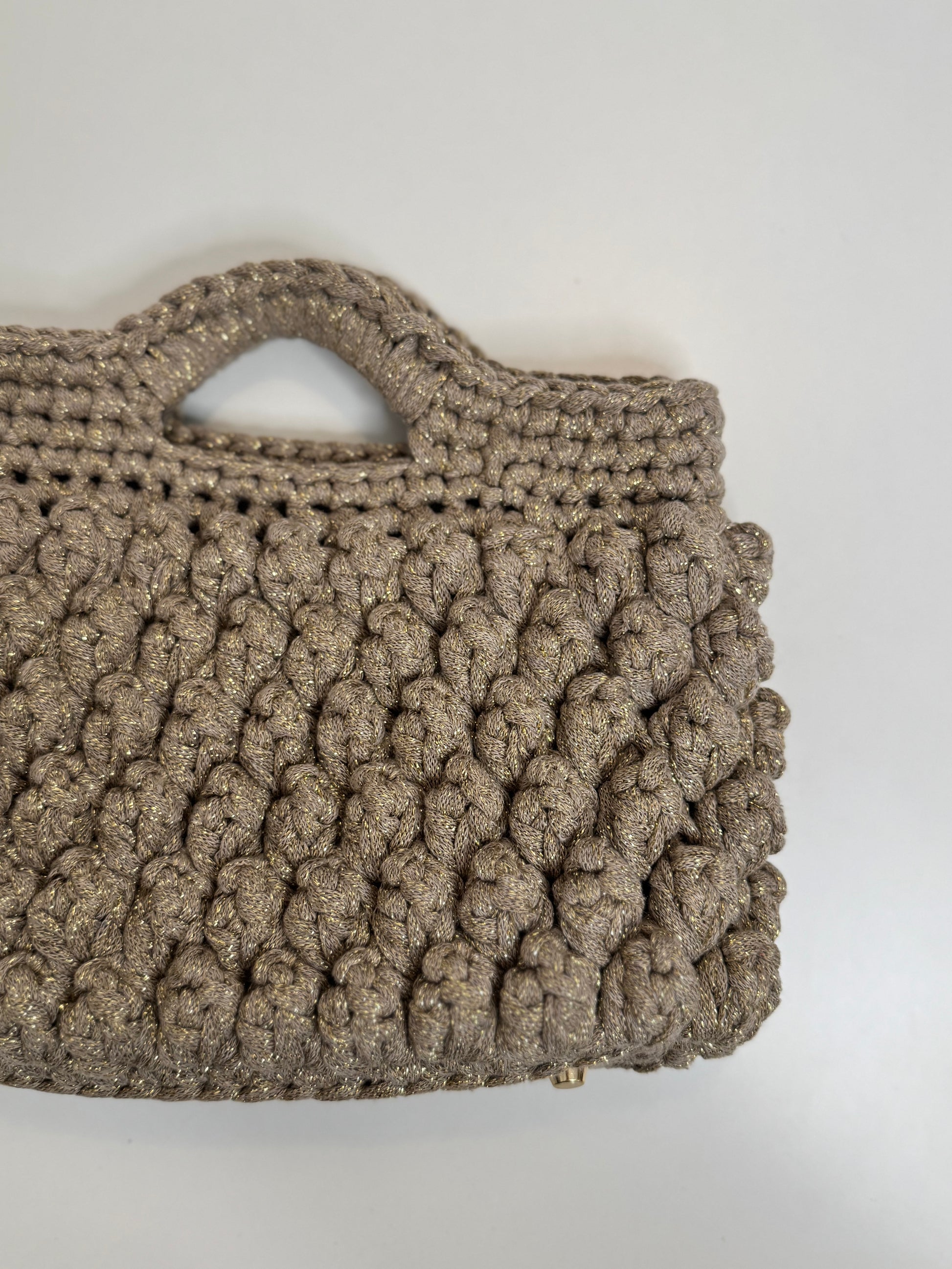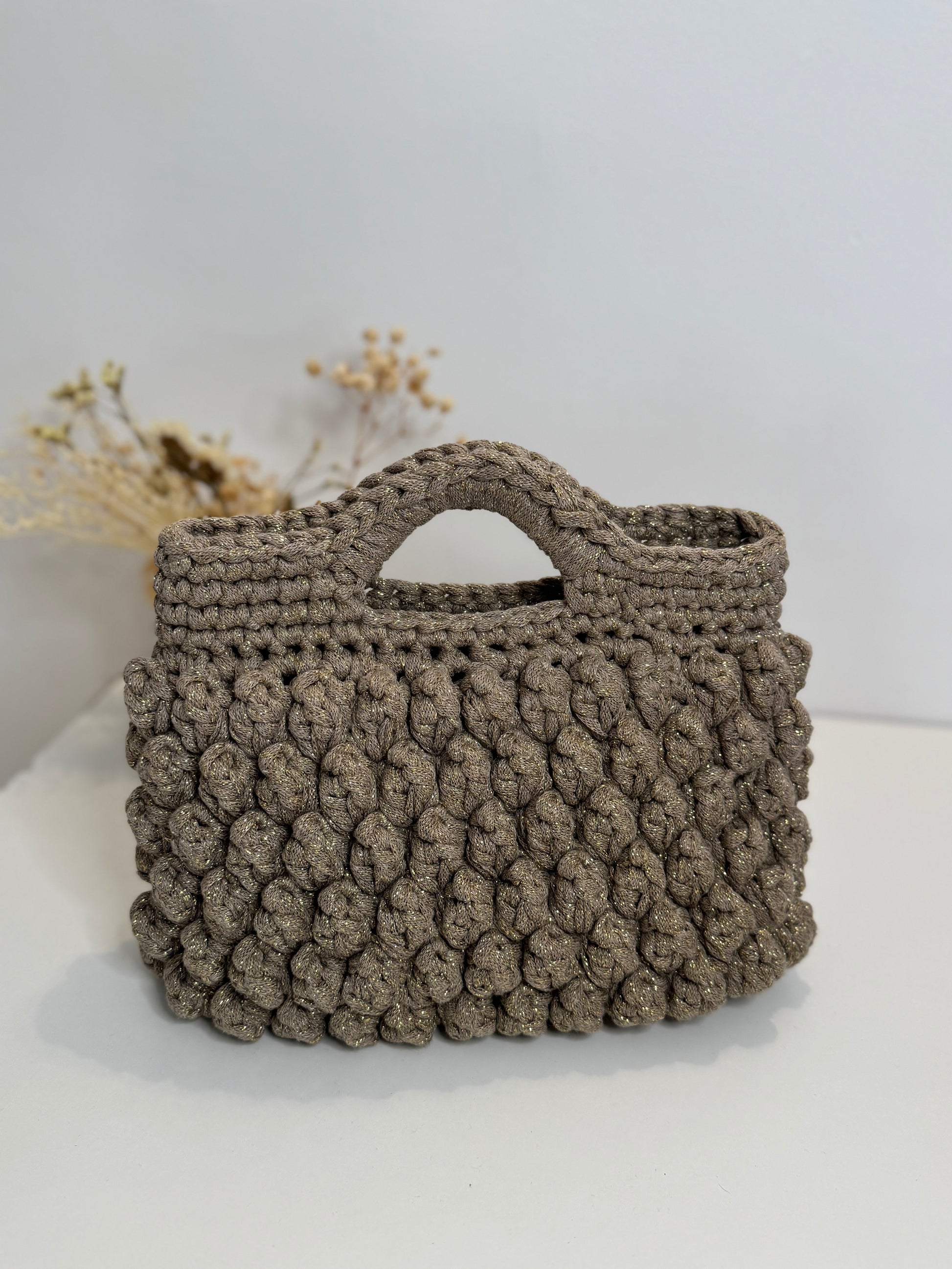 Descubre el bolso Venecia Tostado de Nodo Accesorios: tejido a mano en trapillo reciclado y lurex, este bolso de tono tostado aporta calidez y sofisticación a tus looks. Su textura burbuja, forma rectangular y asas caladas lo hacen cómodo y versátil, perfecto tanto para el día como para eventos especiales.